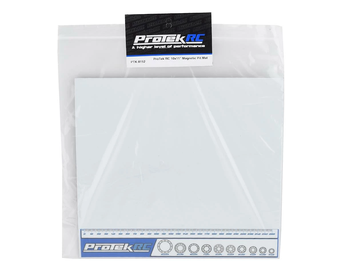 The convenient 10″ tall, 11″ wide size makes the ProTek Magnetic Mat easy to stash away in a variety of spaces. The pre applied decal features a 0-260mm scale that can be used to measure screw lengths, turnbuckles, links, wire lengths and more! Plus, we added bearing profiles to the decal to help identify common bearing sizes from 5×8 to 15×21. The white vinyl surface makes small parts easy to see, is stain resistant, and is easy to clean with soap and water. As an added bonus – the mat fits perfectly inside the instruction manual/setup sheet pocket on the right side of the ProTek P-8 Hauler Bag (PTK-8000). So if you are serious about wrenching and have been looking for a multi-use product to help optimize your work space, the ProTek 10×11″ Magnetic Pit Mat is an affordable solution that every hobbiest can fit into their routine.
