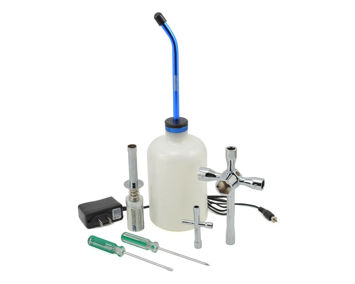This is the ProTek R/C Nitro Starter Set. This package includes many of the critical accessories that are required to get your nitro vehicle running, including a ProTek Fast Fill 500cc fuel bottle, a SureStart rechargeable glow ignitor, a large 5-way wrench, a small 4 way wrench, as well as a small flat head screwdriver and a small Phillips head screwdriver.