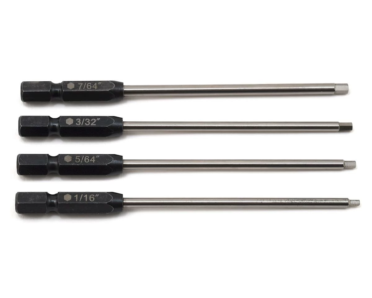 Anyone who has used a cordless drill to wrench on their rig knows that when used properly, power tools can provide an incredible advantage. They not only allow you to replace damaged parts faster, but also help to prevent hand fatigue. ProTek R/C “TruTorque” Power Tool Tips are machined from high quality HSS steel for durability and long life. The precision cut tips provide an exceptional fit with the fastener. The 1/4″ drive hex ends are designed to fit tools that accept a 1/4″ drive hex socket.
